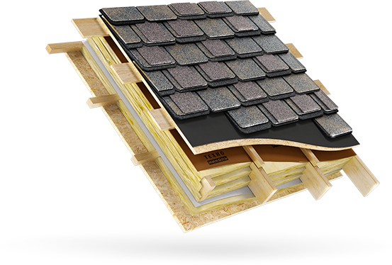Основа мягкой кровли выполнена из стеклохолста. Сверху и снизу она окружена улучшенным битумом. Верхний (лицевой) слой производится из базальтовой посыпки, снизу имеет слой морозостойкой массы, произведенной из битумно-полимерного материала. Сертификация в Европе — обязательная процедура, которую проходит продукция, поставляемая на экспорт. Битумная черепица SHINGLAS — единственная в России, имеющая маркировку соответствия евронормам.
